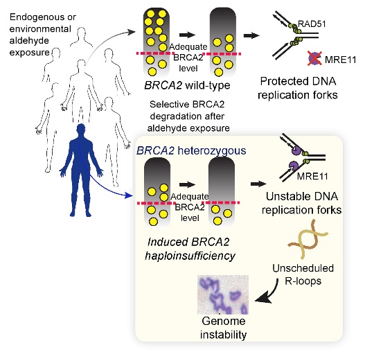 Un effet direct en cas de gène muté : c'est donc une démonstration, in vitro, de la capacité de ces composés environnementaux à induire développement du cancer chez les personnes porteuses de mutations BRCA2. Les aldéhydes vont en effet réduire encore la quantité de protéines de réparation d'ADN que les personnes atteintes d'une copie de gène BRCA2 anormale sont capables de produire. Cependant, en pratique, il est difficile d'échapper totalement à ces expositions.