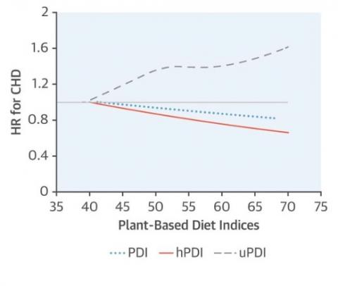 Cette analyse des données de 200.000 professionnels de santé, exempts de maladie cardiovasculaire, d'AVC et de cancer, portant sur l'alimentation et l’incidence de maladies coronariennes révèle qu’un régime alimentaire composé en majorité de végétaux n’apparait pas forcément lié à un bénéfice de réduction du risque cardiaque par rapport à un régime faible en végétaux. De plus, en analysant les données spécifiques associées aux différents régimes végétaux, les chercheurs identifient des différences intéressantes. L’analyse confirme, après prise en compte des multiples facteurs de confusion, que :