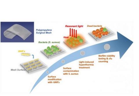 Ce processus de conversion lumière-chaleur a déjà été testé dans des traitements du cancer. Ici, les maillages ont été testés pour leur stabilité à long terme et notamment pour l’homogénéité de la distribution des nanoparticules sur la structure et la solidité de leur ancrage. Ensuite, le maillage a été exposé à la bactérie S. aureus durant 24 heures jusqu'à observation de la formation d'un biofilm à sa surface. Enfin, exposé à une vingtaine d’impulsions brèves et intenses de lumière infrarouge proche (800 nm) pendant 30 secondes pour assurer l’équilibre thermique, le maillage en convertissant la lumière en chaleur brûle et élimine ainsi les bactéries et le biofilm. Et les bactéries du biofilm qui survivent à ce traitement de choc, recouvrent leur sensibilité ou leur vulnérabilité à l’antibiothérapie. Enfin, l’exposition à la lumière proches de l'infrarouge n'endommage apparemment pas les tissus sains environnants.