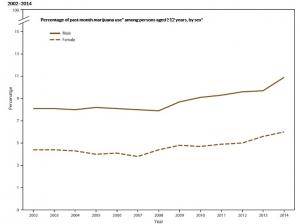 - Au cours de la période 2002-2014, la prévalence de l'usage du cannabis, au cours du mois passé, a augmenté chez les adultes de 18 ans et plus, mais pas chez les plus jeunes de la tranche d'âge 12-17 ans : ainsi, la prévalence de l'usage du cannabis- au cours de la dernière année-