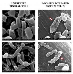 Du courant et des antibiotiques : les chercheurs de Washington utilisent ici avec succès un courant électrique faible, en combinaison avec des antibiotiques, pour combattre les infections bactériennes à Pseudomonas aeruginosa résistantes aux médicaments. « Je ne le croyais pas. La combinaison élimine la quasi-totalité des cellules infectées », écrivent les chercheurs. Ils utilisent ici un e-échafaudage, une sorte de bande électronique constituée de tissu conducteur de carbone imprégnée d'antibiotique pour traiter spécifiquement les bactéries résistantes. L'e-échafaudage conduit un courant électrique qui produit une concentration faible et constante de peroxyde d'hydrogène, un désinfectant efficace, à la surface de la plaie. Le peroxyde d'hydrogène perturbe la matrice du biofilm, endommage l'enveloppe et l'ADN des cellules bactériennes, facilite la pénétration de l'antibiotique et booste ainsi son efficacité antibactérienne. Le grand défi relevé par ce dispositif est le contrôle très rigoureux du courant de manière à pouvoir induire la bonne réaction. Le procédé n'entraîne pas d'effet indésirable, il n'endommage pas les tissus environnants et surtout, il se révèle ici efficace à éliminer toute résistance bactérienne. La demande de brevet est déposée et l'équipe met au point le processus de fabrication. Prochaine étape, les essais cliniques.