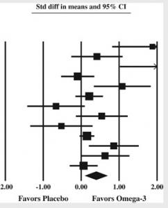 Cependant, si l'analyse montre un effet global bénéfique des AGPI oméga-3 sur les symptômes dépressifs, elle révèle aussi l'hétérogénéité significative des résultats : ceux-ci dépendent en effet de la dose EPA, de la prise d'un traitement antidépresseurs (et également de l'année de publication des études prises en compte).