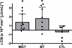 Les recommandations sont, pour l'adulte, environ 30 minutes d'activité physique par jour, soit 150 mn d'activité modérée à intense par semaine. Cette équipe démontre en effet que quelques minutes d'exercice très intense produisent des bénéfices comparables à une pratique plus longue d'exercices d'endurance, telle que préconisée dans les recommandations. L'auteur, Martin Gibala, professeur de kinésiologie à l'Université McMaster, recommande ainsi des « rafales brèves d'exercice intense » et les qualifie de « remarquablement efficaces ». Les scientifiques ont comparé les indicateurs clés de santé -dont la capacité cardiorespiratoire et la résistance à l'insuline (Voir schéma ci-contre « sensibilité à l'insuline » programme intense SIT, programme classique MICT vs CTL)-, avec la pratique de courtes séances, de type sprint, à la pratique d'exercice d'intensité modérée telle que recommandée dans les lignes directrices. L'étude a porté sur 27 hommes sédentaires invités à effectuer 3 séances hebdomadaires de pratique soit intense, soit modérée pendant une durée totale de 12 semaines, vs un groupe témoin privé d'exercice.