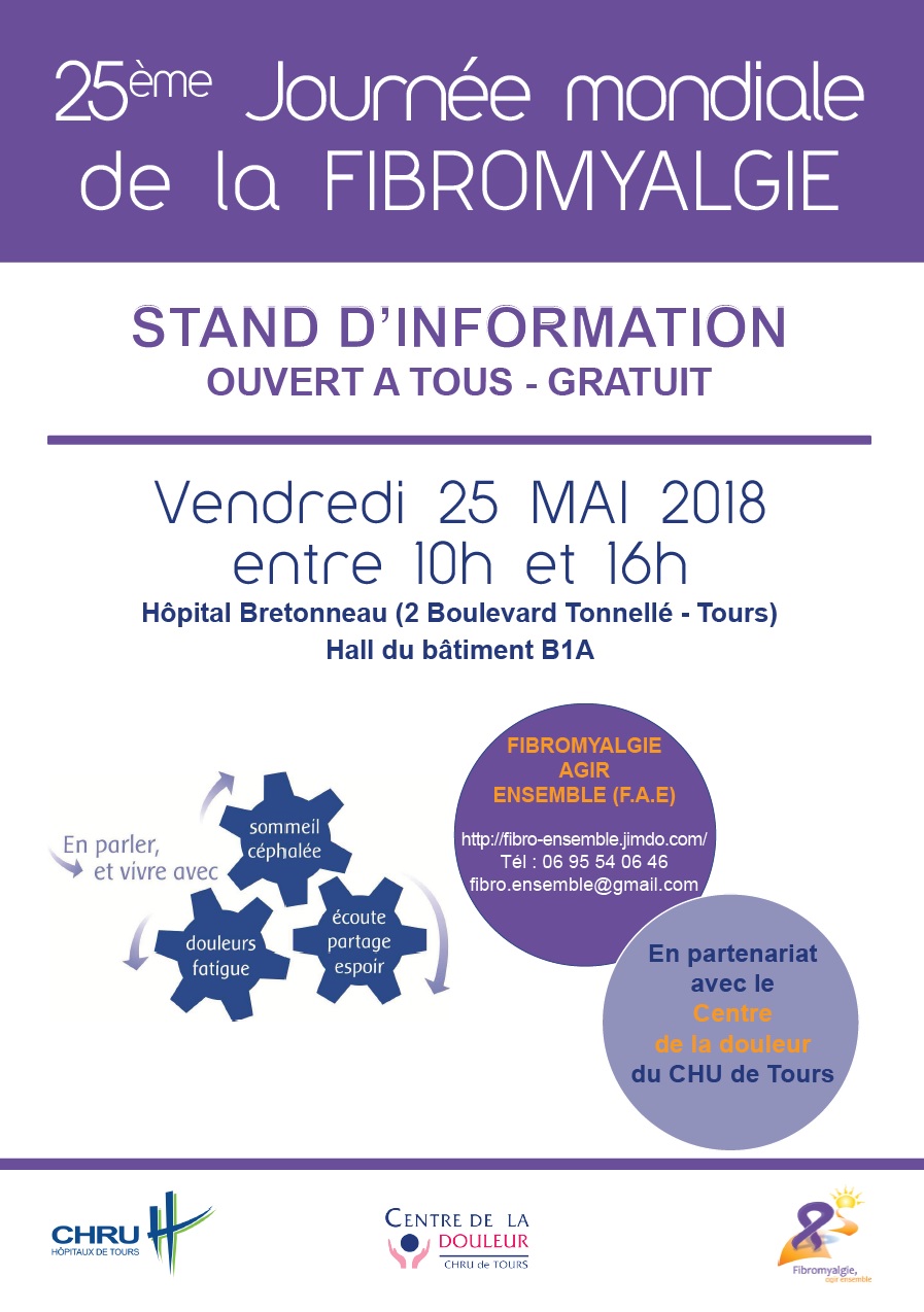 Entre 2 % et 6 % de personnes en France sont touchées par la fibromyalgie, majoritairement des femmes, mais également des enfants, des adolescents ou des jeunes adultes ainsi que des personnes âgées. Le vendredi 25 mai 2018, à l’occasion de la 25ème Journée Mondiale de la Fibromyalgie (date officielle le 12 mai), les personnels du CHU de Tours et de l’association Fibromyalgie Agir Ensemble vous accueillent à leur stand d’informations sur la fibromyalgie, ouvert à tous et sans inscription préalable entre 10h et 16h dans le hall de B1A à l’Hôpital Bretonneau au CHU de Tours.