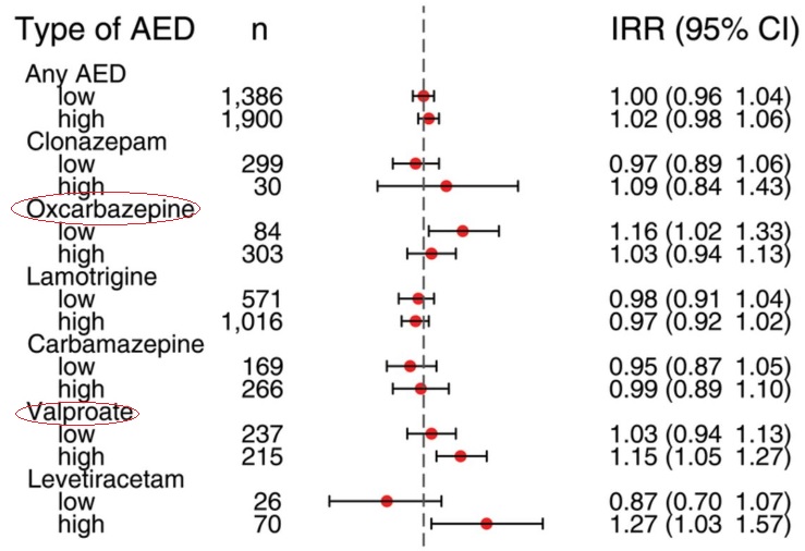 Mais attention, certaines différences apparaissent en fonction de l'anti-épileptique : ainsi, l'exposition prénatale à l'oxcarbazépine ou au valproate est associée à un nombre plus élevé de 8% de contacts chez le médecin, par rapport à l'exposition à d'autres anti-épileptiques (Visuel ci-contre).