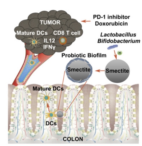 Des études ont montré que certains probiotiques peuvent, via le microbiote intestinal, activer le système immunitaire de l'hôte et le sensibiliser à l'immunothérapie tumorale. Cependant, la prise orale de probiotiques est souvent inefficace et la transplantation de microbiote fécal peut entraîner un risque d'infection. Avec ces microsphères de smectite qui supportent spécifiquement les probiotiques en question, L. acidophilus et B. longum, les chercheurs de l’Université de Nanjing (Chine) parviennent à encourager la formation de biofilms probiotiques à la surface des muqueuses intestinales. L’équipe parvient ainsi à prolonger la survie de ces probiotiques, ce qui permet d’améliorer l'efficacité des chimiothérapies et des immunothérapies anticancéreuses. L’équipe apporte une première preuve de concept de sa thérapie, dans les Cell Reports et sur la souris.