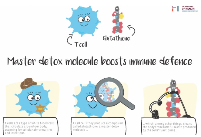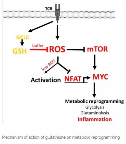 Le glutathion stimule également le métabolisme énergétique des lymphocytes T : au-delà de ses pouvoirs antioxydants, le gluthation se révèle être un commutateur moléculaire clé pour le système immunitaire : en effet, la molécule stimule également le métabolisme énergétique des lymphocytes T et les aide à croître, se diviser et combattre les virus. Les chercheurs montrent ainsi chez la souris que sans glutathion, les cellules T ne sont plus complètement fonctionnelles; Elles restent en état d'hibernation et aucune réponse immunitaire ne plus se produire.
