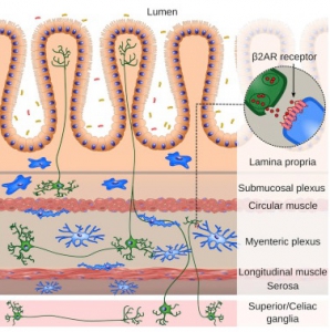 Les neurones font réagir les macrophages plus rapidement : Les macrophages de la musculeuse portent sur leur surface des récepteurs qui leur permettent de répondre à la norépinéphrine, une substance de signalisation produite par les neurones. La présence du récepteur peut indiquer un mécanisme par lequel les neurones signalent aux cellules immunitaires de mettre un terme à l'inflammation. Les neurones permettent ainsi aux macrophages de répondre nettement plus rapidement à une infection, même sans être directement en contact avec l'agent pathogène.
