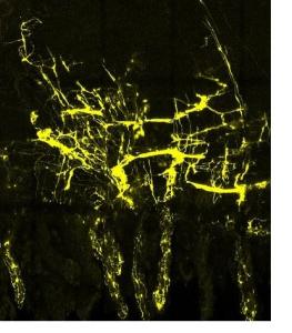 Un système chaotique pourtant bien organisé : au cours du développement, une population unique et dynamique de cellules connue sous le nom de cellules progénitrices se divise pour produire des copies d'elle-même et générer ainsi de nombreux autres types de cellules. En utilisant des outils d'analyse génétique, l'équipe a identifié des cellules progénitrices du système nerveux entérique, les a caractérisées avec des couleurs uniques puis a suivi leurs "descendants" : les cellules nerveuses (jaune sur visuel ci-contre) provenant de la même cellule mère se retrouvent organisées en colonnes 3-D qui s'étendent à travers les couches de la paroi intestinale. L'idée étant, en examinant le type de cellules produites par des progéniteurs uniques, de mieux comprendre leurs propriétés et leur implication dans les différentes fonctions. Plusieurs constatations importantes sont alors effectuées par l'équipe :