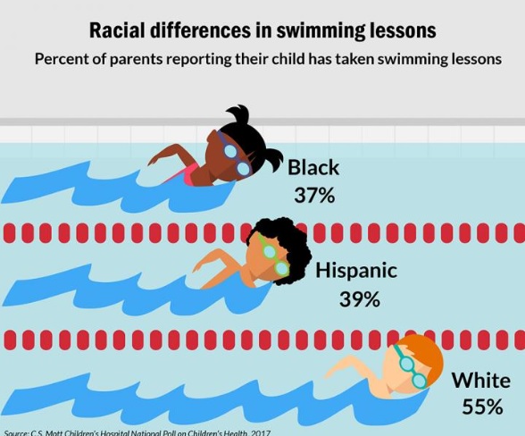 Le gap est à combler entre les communautés : ces données varient aussi selon les communautés ethniques, 80% des parents blancs affirmant que leur enfant sait bien nager vs 66% chez les foyers hispaniques et 49% chez les foyers afro-américains. 55% des parents blancs disent que leur enfant a pris des leçons de natation, vs 39% des parents hispaniques et 37% des parents afro-américains. Le coût et l'accessibilité aux cours de natation apparaissent comme les 2 principaux obstacles à surmonter. En effet, certains quartiers ne sont pas équipés en piscines publiques. Les auteurs appellent donc les politiques à lancer de nouveaux programmes « nautiques » pour les rendre plus accessibles et abordables.