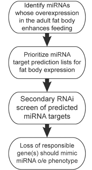 A la recherche d'un signal inhibiteur : les chercheurs se concentrent ici sur de courts ARN non codants ou microARNs (voir schéma ci-contre), qui sont des inhibiteurs connus de l'expression des gènes. Ils ont d'abord recherché les microARNs qui surexprimés dans le tissu adipeux affectent le comportement alimentaire, puis, dans un second temps les cibles géniques de ces microARNs. C'est ainsi que les chercheurs identifient « miR-iab-4 », un miARN qui augmente l'alimentation de plus de 27%, et identifient son gène cible violet (« Purple »).