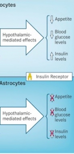 A la recherche du mécanisme moléculaire qui contrôle notre métabolisme : lorsque les scientifiques examinent l'activité des récepteurs de l'insuline sur la surface des astrocytes, ils constatent en cas d'absence de ces récepteurs, une réduction de l'activité des neurones à pro-opiomélanocortine (POMC) du cerveau, qui ralentissent l'absorption alimentaire. Dans le même temps, les hormones comme l'insuline et de la leptine agissent spécifiquement sur les cellules gliales pour réguler la consommation de sucre dans le cerveau, tels un « interrupteur de sucre ». Sans les récepteurs d'insuline, les astrocytes deviennent moins efficaces pour le transport de glucose dans le cerveau, notamment aux centres de la satiété, situés dans l'hypothalamus.