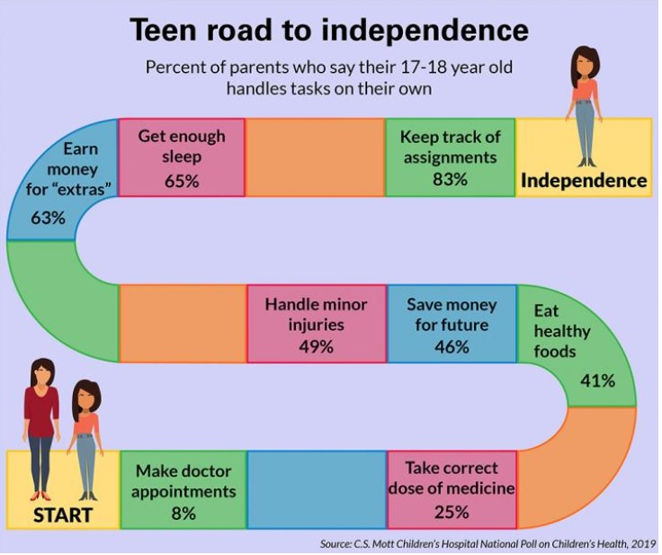 Ce processus « inclut tout », de la préparation à la vie professionnelle et à la responsabilité financière à la protection de la santé et du bien-être. Cependant, le sondage, mené auprès de 877 parents d'au moins un enfant âgé de 14 à 18 ans, suggère que les parents ne laissent pas les rênes à leurs adolescents autant qu’il le faudrait pour qu'ils aients toutes les chances de réussir cette transition :
