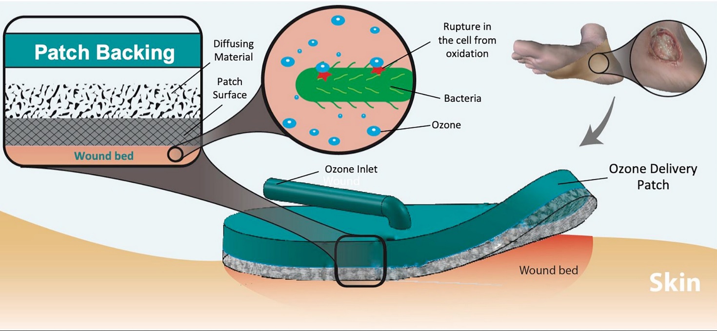La thérapie à l'ozone est une option de traitement antimicrobien en phase gazeuse, utilisée aujourd’hui pour traiter un nombre croissant de patients. Cependant, en général, ce type de traitement est dispensé à l’hôpital. Ici, le principe est que le patch « gazeux » est appliqué sur la plaie, puis connecté à un petit appareil générateur d'ozone alimenté par batterie. L'ozone gazeux est diffusé de manière hyper-ciblée à la surface de la peau sur le site de la plaie et permet ainsi d’accélérer la cicatrisation des plaies.