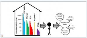 Quel processus : les composés chimiques sont libérés dans l'air et entrent dans la poussière et se déposent sur le sol, les meubles et autres objets. Ces composés sont inhalés, ingérés ou absorbés par la peau. Les nourrissons et les jeunes enfants sont particulièrement à risque d'exposition aux substances chimiques présentes dans la poussière parce qu'ils rampent, jouent à même le sol, et vont également mettre leurs mains à la bouche.